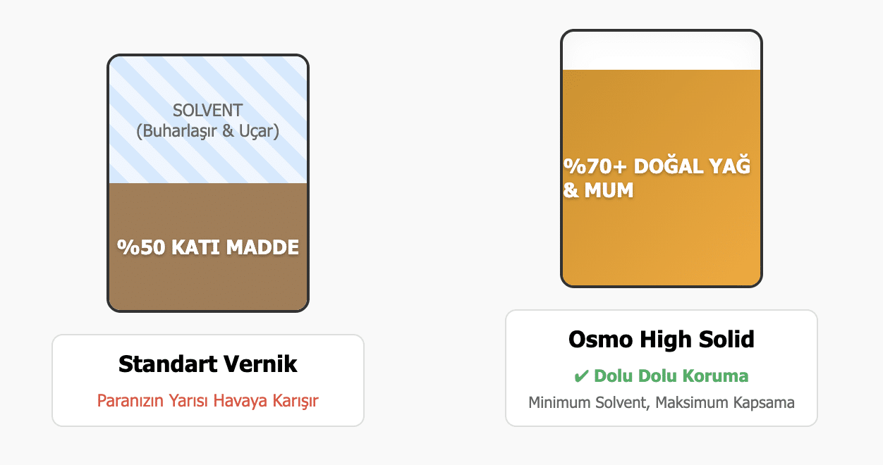 - Full Solid (Profesyonel): %100 katı maddedir. Hiç solvent içermez (Örn: Osmo 2K Wood Oil).